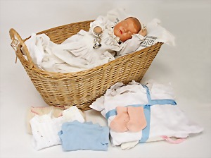 Träumerchen, Magnesitkopf, Körper beschwert, mit Po-Loch u. Bauchnabel, Kopf stellenw. überstrichen, 53 cm, mit Taufkleid u. Haube, einige Teile Bettzeug u. Kleidung, Handarbeit, kl. Baby-Rassel