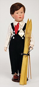 Friedebald, mit Schild VEB Puppenwerkstätten Bad Kösen, braune Echthaarperücke, Kunststoffkopf, linke Wange farbl. etwas ausgetupft, Stoffkörper, 48 cm, alte Kleidung, Wachstuchschuhe, 1 Paar Holz-Ski