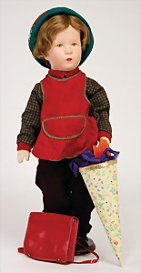 Puppe, Stoffkopf, Hinterkopfnaht erst unter der Perücke sichtbar, Stoffkörper, mit abgenähten Kniekehlen, 50 cm, Stoff Farbunterschied am Halskranz, mit Schultüte u. Schulranzen