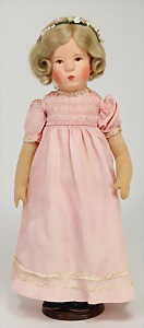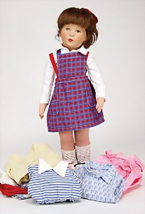 Mädchen, Kunststoffkopf, Echthaarperücke, auf Stoffkörper, mit geraden Beinen, 48 cm, Nasenspitze farbl. ausgetupft, dazu einige Kleidungsstücke für Käthe Kruse passend