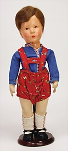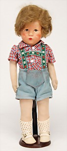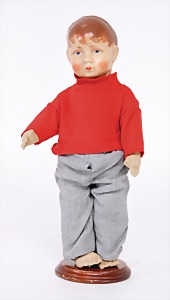 Junge, Stoffkopf, 1 Hinterkopfnaht, Echthaarperücke, Farbe im Nacken abgeplatzt, kl. Farbabplatzer auf der Nasenspitze, auf Stoffkörper, Beine etwas angeschmutzt, 35 cm, Kleidung teilw. neu