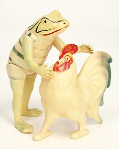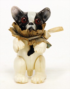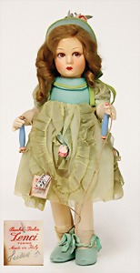 Flessibila, mit Schild, Kunststoffkopf, Echthaarperücke, gemalte Augen, etwas Farbabrieb an der Nasenspitze, Baumwoll-Trikotkörper, weich gestopft, bewegl. Skelett, 47 cm