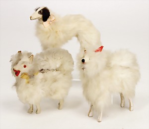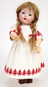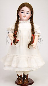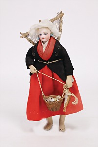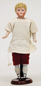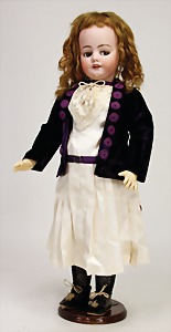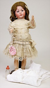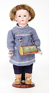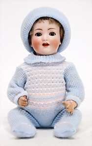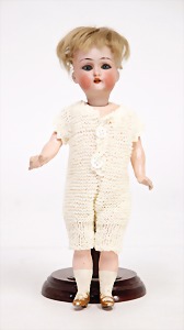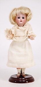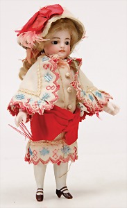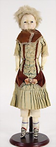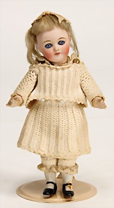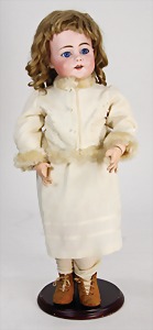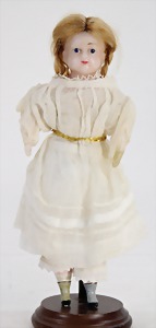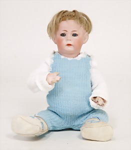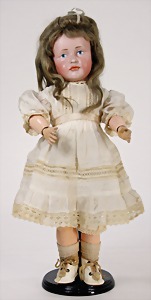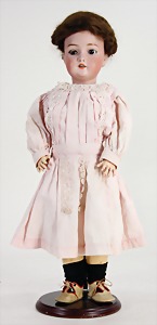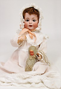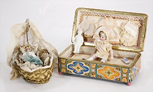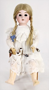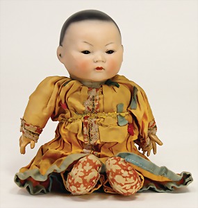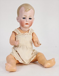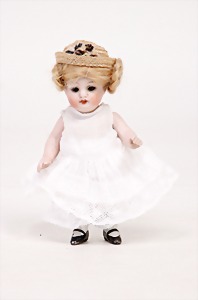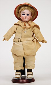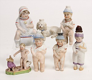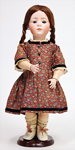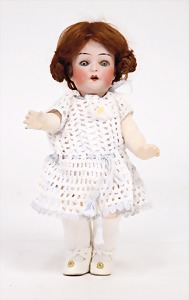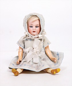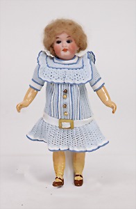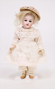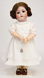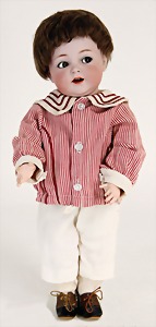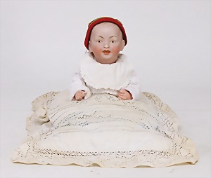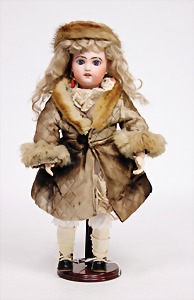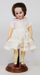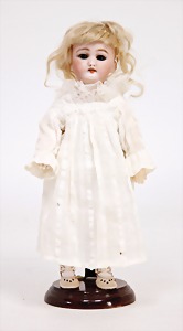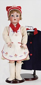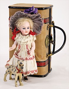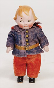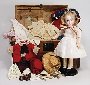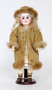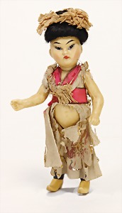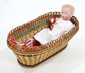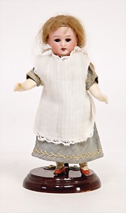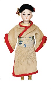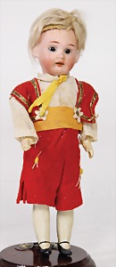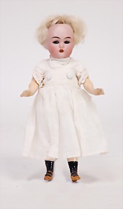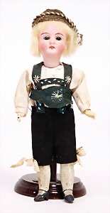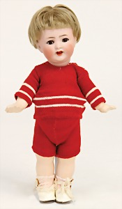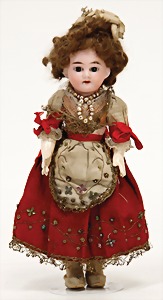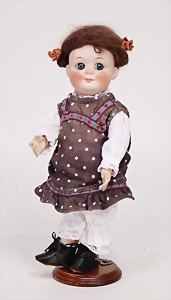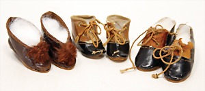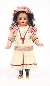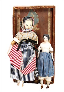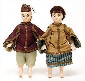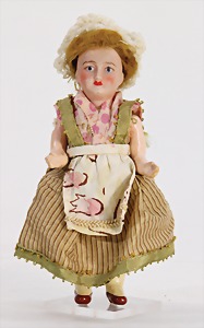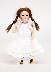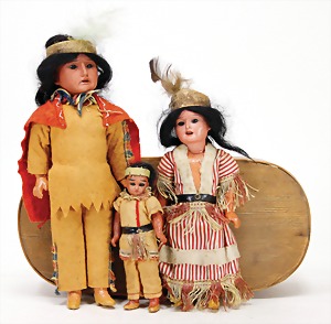3 Indianer-Puppen, ungem. 1x 15 cm, Biskuit-Kurbelkopf, fest eingesetzte braune Glasaugen, geschl. Mund, Masse-Stehkörper, 1x 20 cm, AM, Biskuit-Kurbelkopf, braune fest eingesetzte Glasaugen, off. Mund, Kopf geklebt, Masse-Stehkörper, ungem., 1x 27 cm, Biskuit-Kurbelkopf, fest eingesetzte braune Glasaugen, off. Mund, oben Zähne, Masse-Stehkörper, anmodellierte Schuhe, Orig.-Mohairperücken, in Spanschachtel