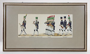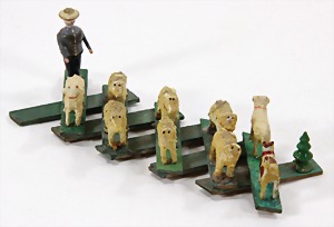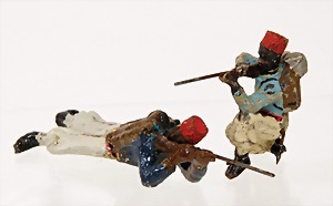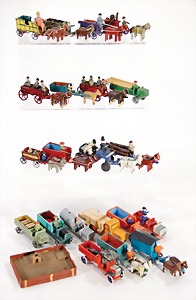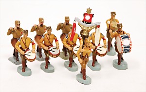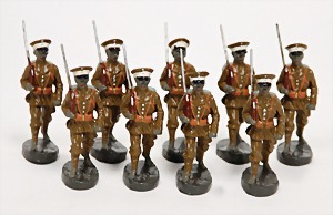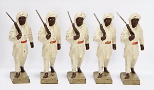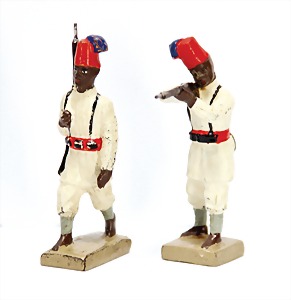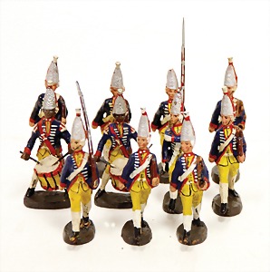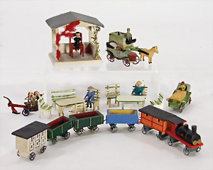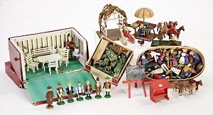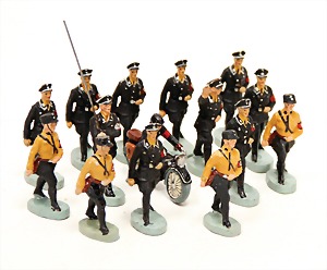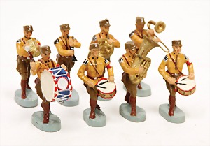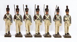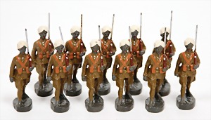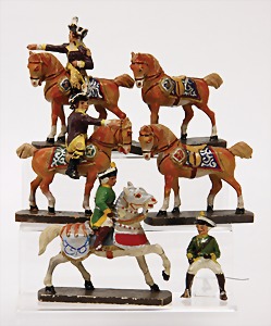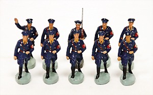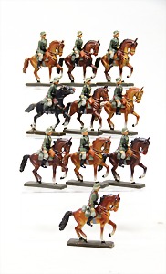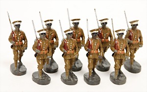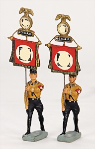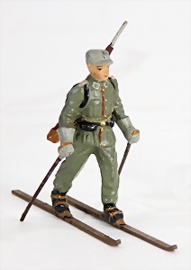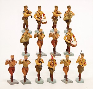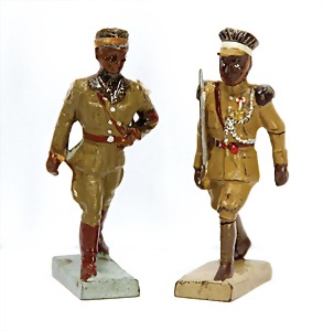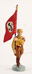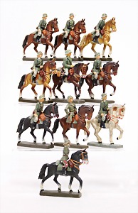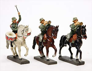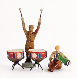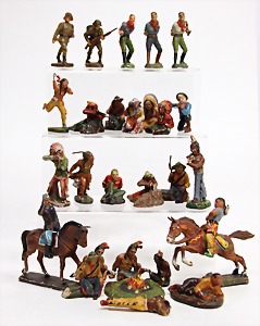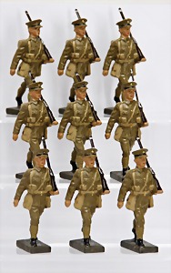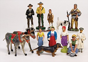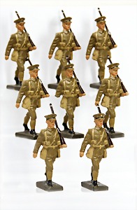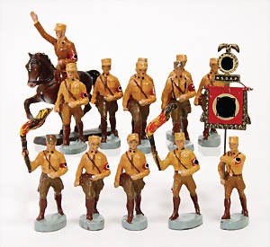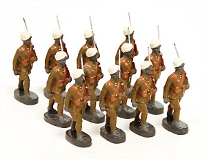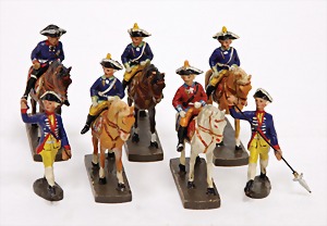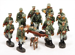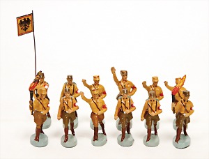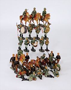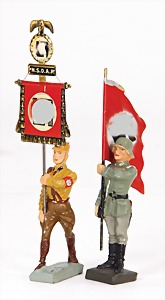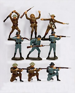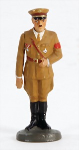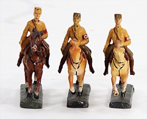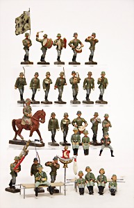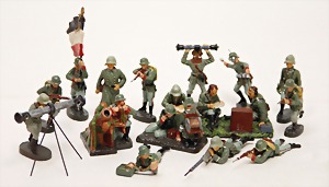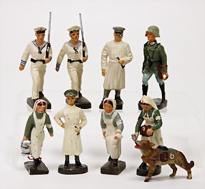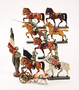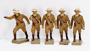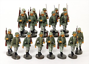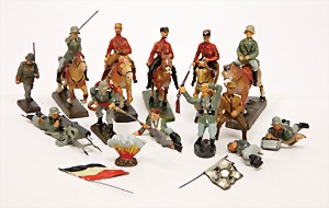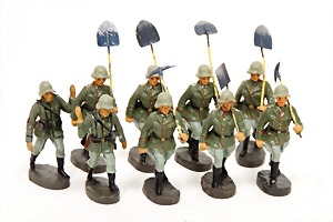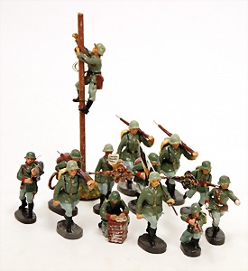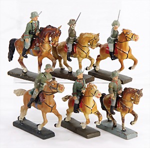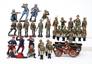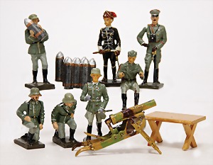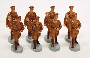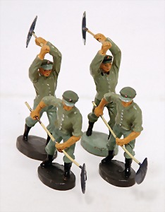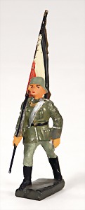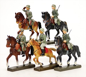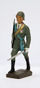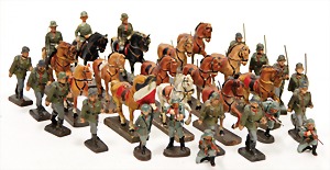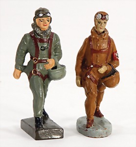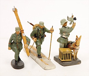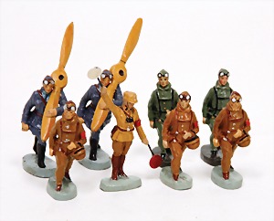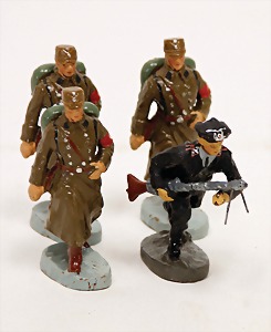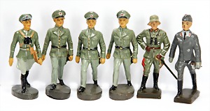 4 Teile Elastolin, Masse, 2. Weltkrieg, 7,5 cm, Offiziere, marschierend, 1 x mit Fernglas u. seitl. Tasche, hinten Tornister, 1 Offizier mit Fernglas u. Säbel, 1 Figur mit bewegl. Arm, 1 Figur Luftwaffe, mit Säbel marschierend, 2 Figuren Lineol, Zust. 1-2