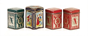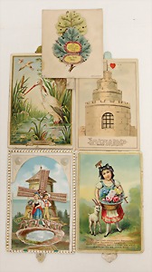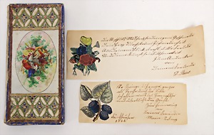 Glückwunschkarten, 1862 – 1865, Schatulle bunt lithogr., 4 Papierstreifen mit Schrift u. Zeichnungen, Blumen u. Früchte
