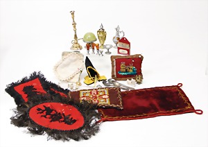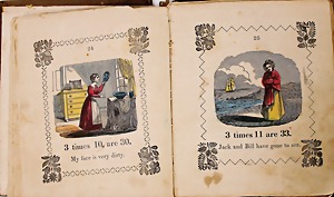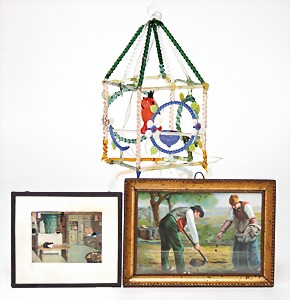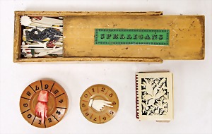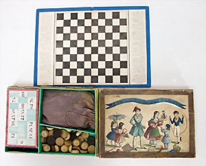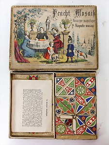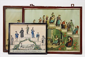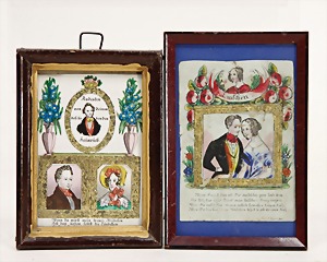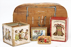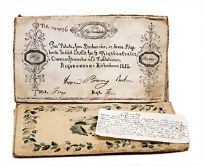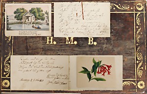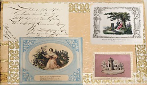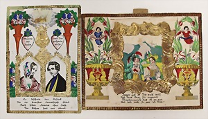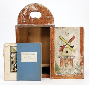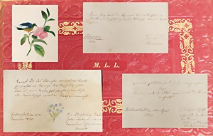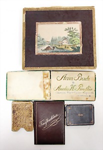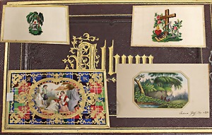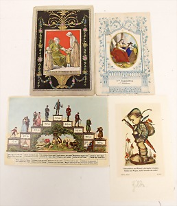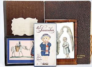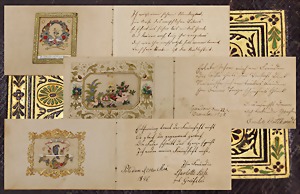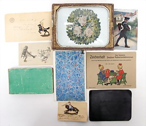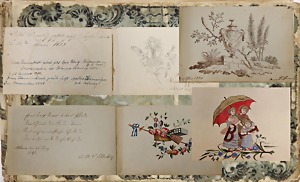 Schatulle, mit Chromolithographie, innen verspiegelt, kl. Album, mit Sprüchen, Zeichnungen, 1 handcolorierte Chromolithographie, 1840 – 1843, 7 x 10 cm, 1 Album, 1838 – 1884, nur ein Teil der Seiten beschriftet, 2 handcolorierte Chromolithographien, 1 Tauf-Büchlein, 1911