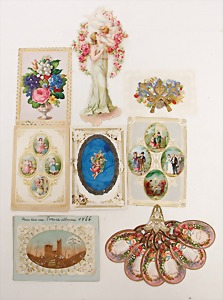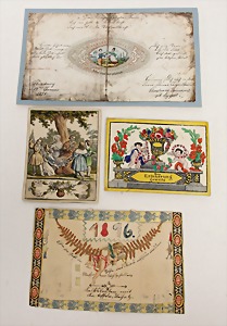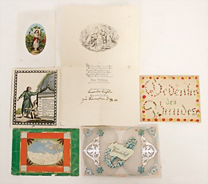 Konv. 12 Teile, 1825 – 1900, Glückwunschkarten, teilw. handcoloriert, 1 Postkarte, 1 gesticktes Bild, dazu kl. Schatulle