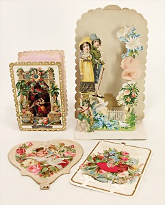 Konv. Aufstellkarten, 19,5 cm, Liebespaar, Paradiesgarten, 12 cm, Blumenschmuck mit Tauben, 12 cm, Herz mit Zugmechanismus, 12,5 cm