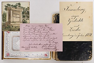 Sammlung eigener Gedichte u. Lieder, Lauenburg, im Jahre 1821, handgeschrieben, Denkmal der Freundschaft, dazu Souvenir ohne Namen, kl. Poesiealbum, Schatulle mit Blättern zum Einlegen, 1850 – 1878, 1 Aquarell, 2 Chromolithographien, 1 Bleistiftzeichnung sowie Texte