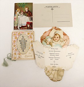 Konv. 6 Glückwunschkarten, darunter 1 Aufklappkarte, mit Fehlstellen, 1 Karte mit Zugmechanismus, dazu 1 Menükarte zum Fest der Taufe, unten etwas geknickt, 1880 – 1910