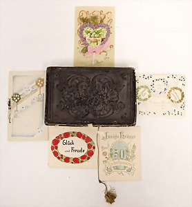 kl. Kästchen, mit Taufbrief, Aufstell-Glückwunschkarte, kl. Fehlstellen, Rose von Ems, Rose von Breslau, 2 Postkarten aus Celluloid, Glückwunschkarten, meist um 1900, mit kl. Schatulle