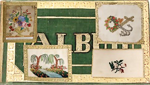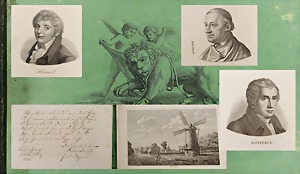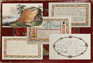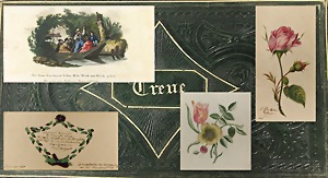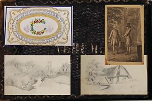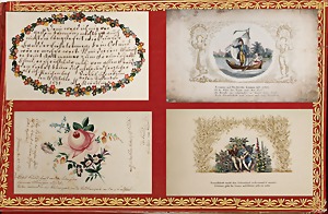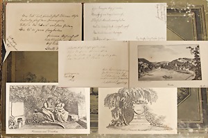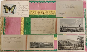 Denkmal der Freundschaft für Berta, 1821 – 1828, 4 Wiener Billetts, 1 farbiger Kupferstich, 1 Stickerei, 1 Haarbild, 1 Aquarell, 2 Kupferstiche, viele Seiten nicht beschriftet