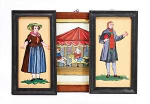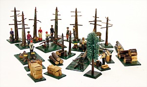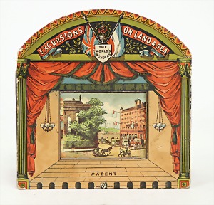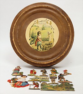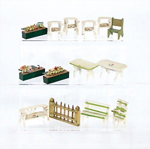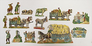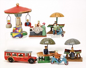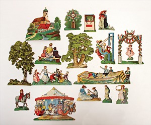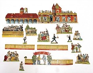 Papier-Aufstellfiguren, mit Landschaft u. Gebäudeteile, Restaurant, Cafe, die Gartenwirtschaft, Höhe d. Figuren 7,5 cm, Presspappe, farbig lithogr., um 1900, dekorativ