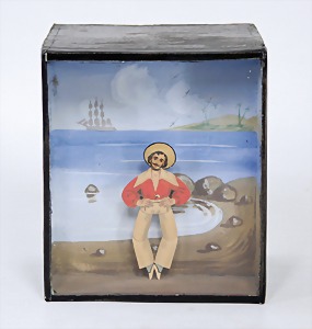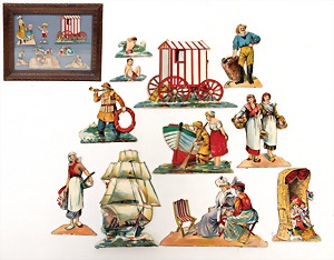Strandleben, Seebad, Presspappe, bunt lithogr., Höhe d. Aufstell-Figuren ca. 8,5 cm, Personen, Schiffe, Strandkorb, etc., reichh., um 1900