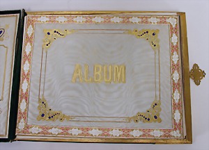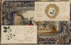 Album für Karl Gotthardt, 1838 – 1875, von Vater, Mutter, Verwandten, Freunden, Spandau, Berlin (Böhmen, Schleswig), 10 Wiener Billettes, 13 colorierte Litho´s, 1 Aquarell, museal, Einband Gold-Prägedruck, Kante altersbed. verschlissen, innen schöner Orig.-Zust.