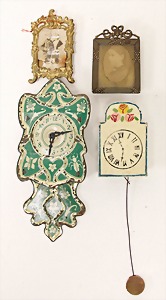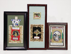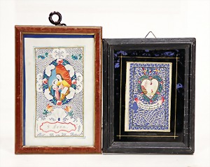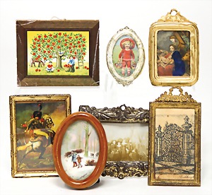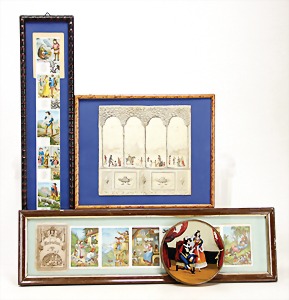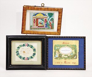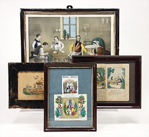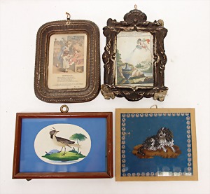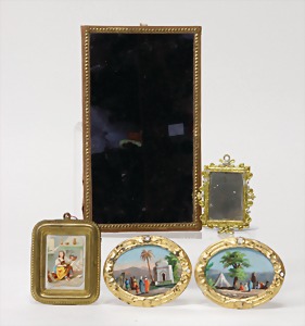 4 Teile gerahmt, Biedermeier, Papierarbeit, 11,5 x 9,5 cm, 12,5 x 9, 9 x 11,4, guter Zust., 4,2 x 5 cm, kl. Fehlstellen