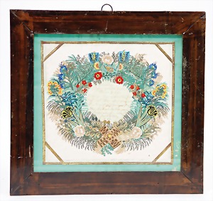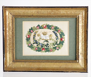 Papierarbeit, gerahmt, 1849, Spruch mit floralem Dekor, außen Goldrand, Innenmaß 25 x 26,5 cm
