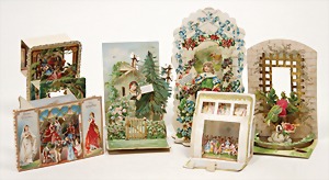 7 Teile Glückwunschkarten, 1860 – 1900, dazu 1 kl. Kalender als Fächer, ausgefallen