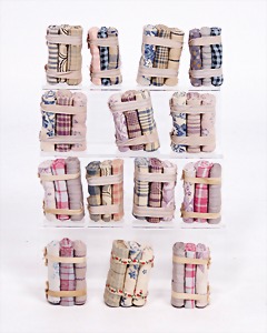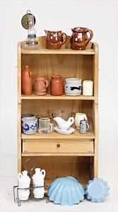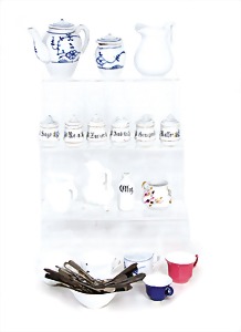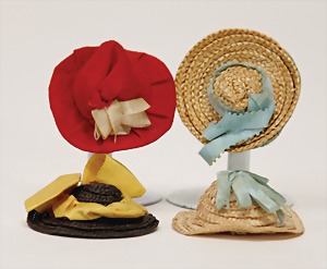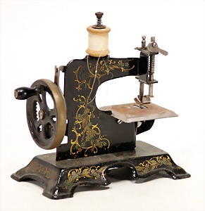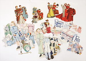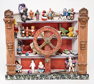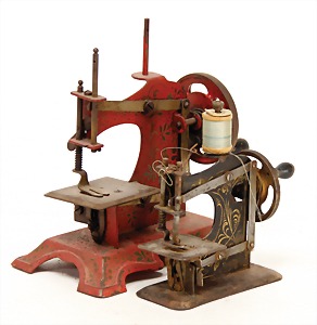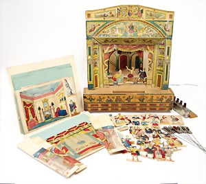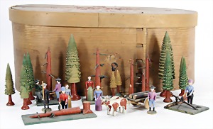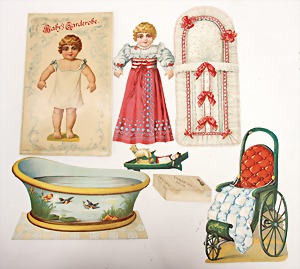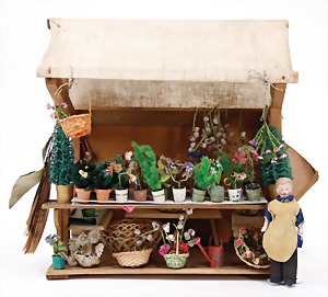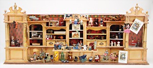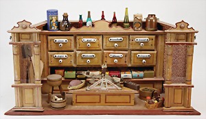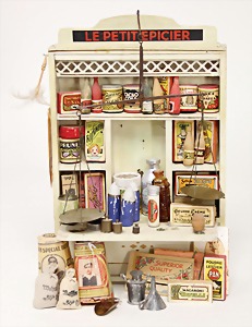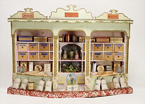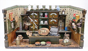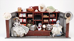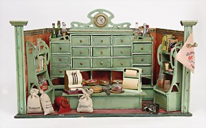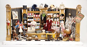 Kaufladen, als Modeladen eingerichtet, 84 x 41 x 40 cm, Wandtapete später, mit reichh. Zubehör, mit Porzellan-Halbpuppe, Stoffkörper, Porzellan-Beine, 24 cm, 1 Daumen weggebrochen, dazu 2 kl. Porzellan-Halbpuppen (Nadelkissen), dekorativ