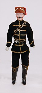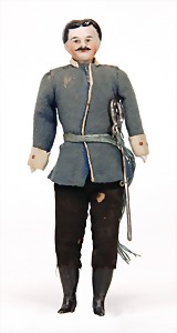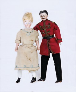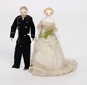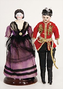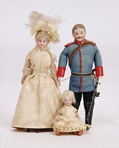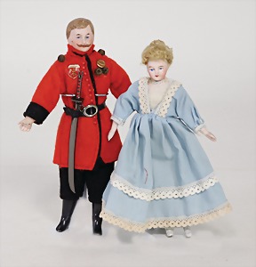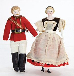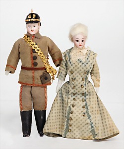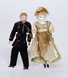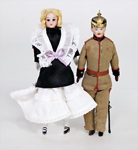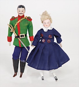 2 Puppenstuben-Puppen, Soldat, mit Pickelhaube, 16 cm, Biskuit-Brustblatt-Kopf, -Arme u. -Beine, aufgemalter Schnurrbart, Stoffkörper, Orig.-Filzkleidung, mit Säbel, Dame, 16,5 cm, fest eingesetzte Glasaugen, Biskuit-Brustblatt-Kopf, -Arme u. -Beine, Stoffkörper, Kleidung alt o. aus alten stoffen genäht