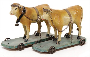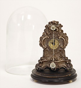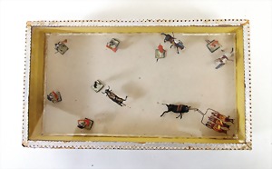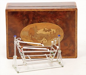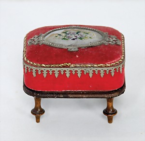 kl. Schatulle, in Hockerform, innen mit Stock, Griff Bein, 5,5 cm, Zylinder und Handschuhe, insgesamt 6 x 7 cm, für hochw. Stube o. Modeladen