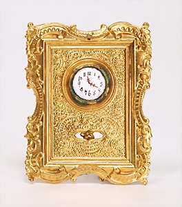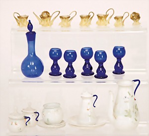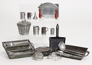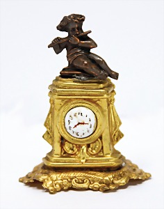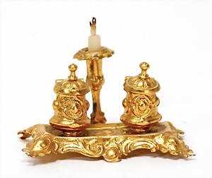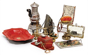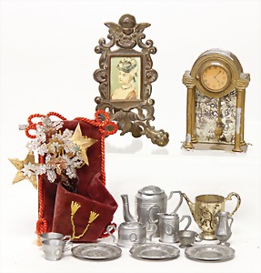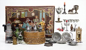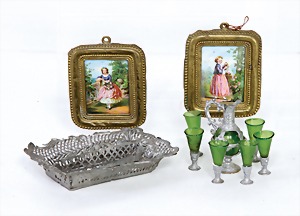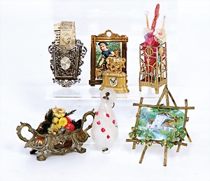 Puppenstuben-Ausschmückungsteile, Kaminuhr, Messingblech vergoldet, 4,5 cm, kl. Staffelei, Bild, Schirmständer, Zinn, Zeitungshalter, Zinn, Leuchter, Glas