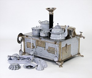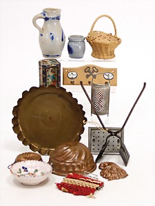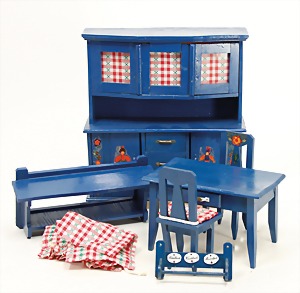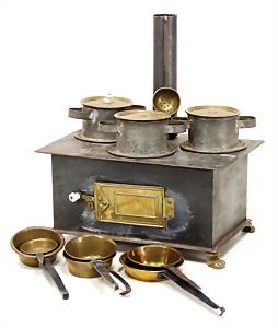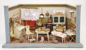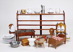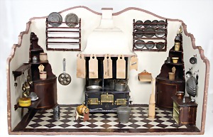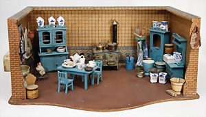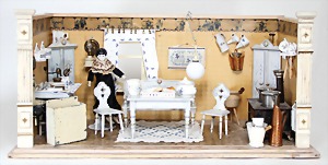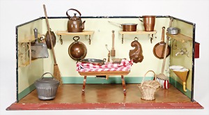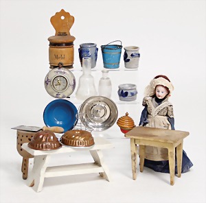 Puppenküchen-Gehäuse, 72 x 34,5 x 33 cm, 1 Fenster unverglast, alte Wand- u. Bodentapete, schönes Holz-Mobiliar, handbemalt, kl. Blech-Herd mit Löwentatzenfüßen, Porzellan-Brustblattkopf-Puppe, glasiertes Porzellan, schwarz modellierte Frisur, Stoffkörper, 22 cm, einige Ausschmückungsteile wie Porzellan, Geschirr, Besteckkasten mit Besteckteilen, u. anderes