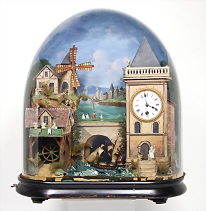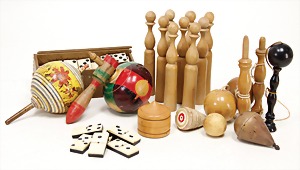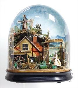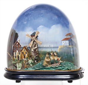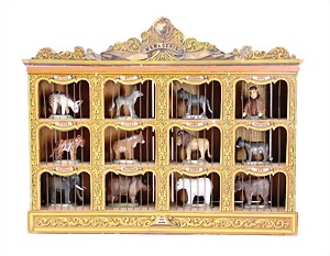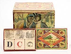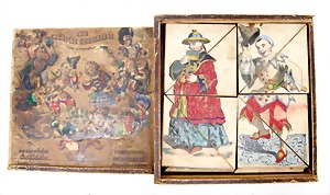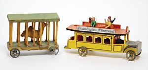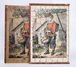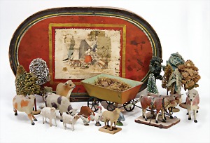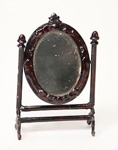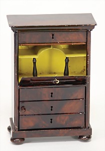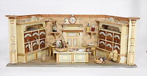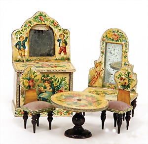 Manufaktur-Puppenhaus, 2-stöckig, mit Erker u. Balkon, 31 x 25 x 55 cm, Papier beklebt, mit einigen Fehlstellen, Erdgeschoss mit schönem Biedermeier Holz-Mobiliar, mit Seide bezogen, Tisch, 3 Stühle, 2 Sessel, Eckregale, Standspiegel u. Kommode, kl. Zinn-Herd, im Obergeschoss 1 Kinderzimmer mit 3 Zinn-Betten, 1 Wäscheschrank, Tür verglast, 2 kl. Porzellan-Püppchen, Bärenfell, 2 Wandbilder, 1 Spiegel, Zinn