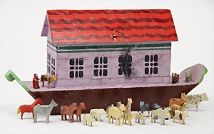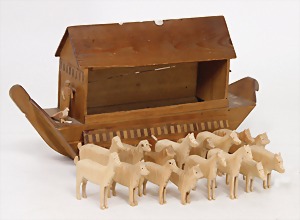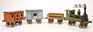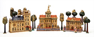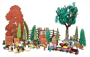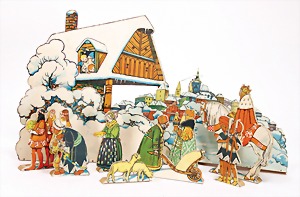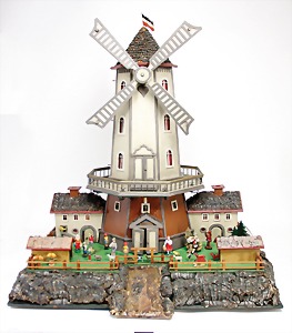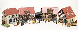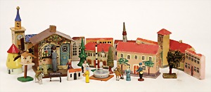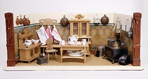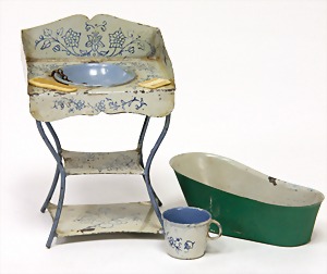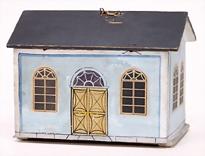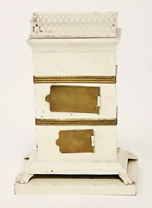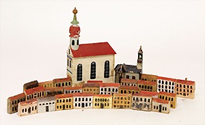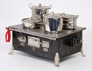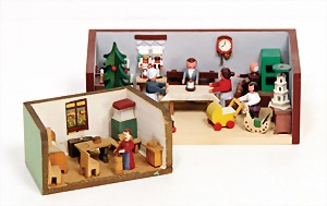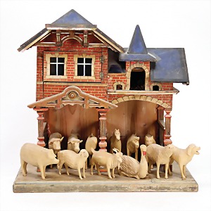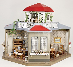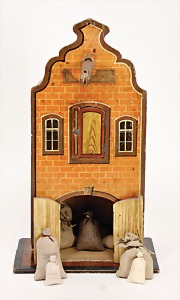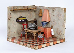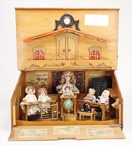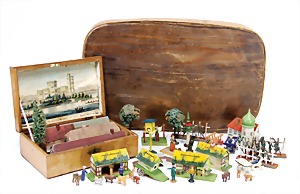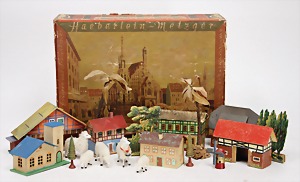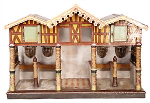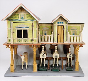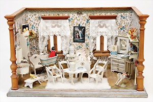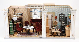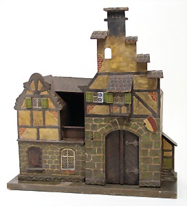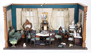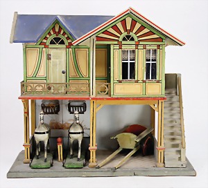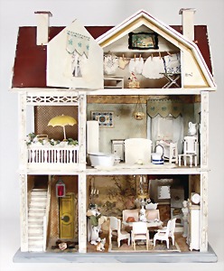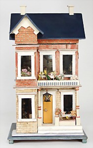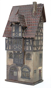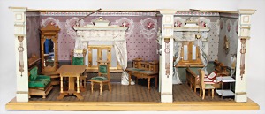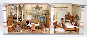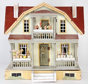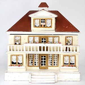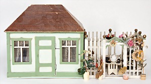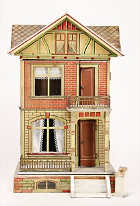 3-stöckiges Haus, 65 x 40 x 80 cm, mit Treppenaufgang, 3 Durchgangstüren, alte Wand- u. Bodentapete, Erdgeschoss mit Wohnzimmer u. Erker, Holz-Mobiliar, mit Seide bezogen, Ornamente, Papier aufgeklebt, Blech, Blech-Ofen, perlenbesetzter Kronleuchter, Obergeschoss Schlafzimmer, Jugendstil, Holz, Bett mit Schrank, Kommode u. Waschtisch, kl. Balkon-Garnitur, Blech handbemalt, Tisch mit Sonnenschirm u. Stuhl Dachgeschoss zum Öffnen, mit Wäscheleine u. Bügelbrett