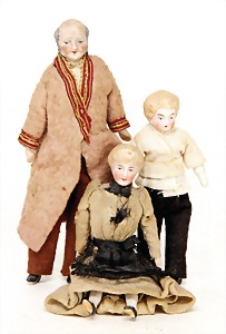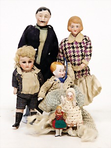 3 Puppenstuben-Puppen, Kinder, 10,5 cm, Mutter, 15 cm, Biskuitbrustblatt-Köpfe, -Arme u. -Beine, Stoffkörper, alte Kleidung