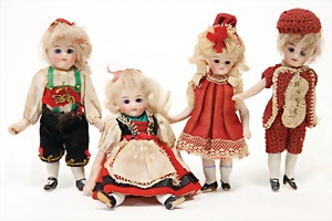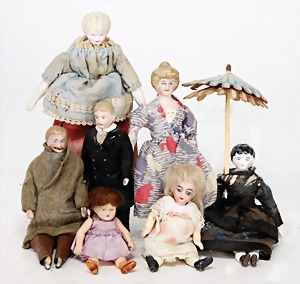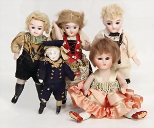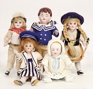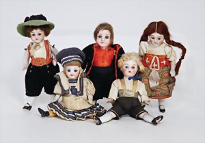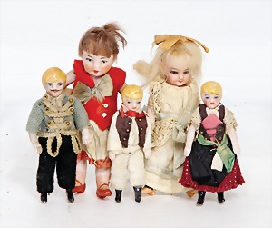 5 Puppenstuben-Puppen, Ganzbiskuit, 6 - 8,5 cm, alte Kleidung, 1 x Glasaugen, 4 x gemalte Augen, 1 kl. Puppe mit aufgemaltem Schnurrbart, ausgefallen