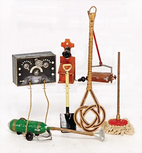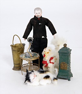 Puppenstuben-Ausschmückungsteile, Großvater, 15 cm, Biskuit-Brustblatt-Kopf, -Arme u. -Beine, Stoffkleidung, kl. Telefon, Zinn, Schirmständer, Messingblech geprägt, kl. Zinn-Ofen, kl. Fellkatze, Fellhund, Beistelltisch