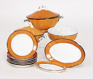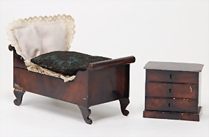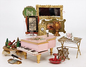 2-tlg. Stube, mit Erker, 94 x 40 x 37 cm, um 1900, Wohnzimmer-Möbelprogramm, wohl Gottschalk, Ecksofa mit Überbau u. Schränkchen, verspiegelt, H: 21 cm, runder Tisch, 2 Sessel, Stuhl, Bank, 1 Standuhr, 1 Kommode, dazu Schlafzimmer-Möbelprogramm, Holz, 2 Betten, Schlafzimmer-Schrank, 2 Nachtschränkchen, Kommode, einige Ausschmückungsteile, Porzellan, Blech-Ofen mit Kohlenschütte, 2 alte Puppenstuben-Lampen, 1 x Kronleuchter mit Glasperlen, 1 x Zinn-Lampenschirm mit Glasaufsatz