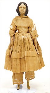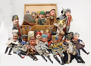2 Puppenstuben-puppen, Soldat, 16,5 cm, Biskuit-Brustblatt-Kopf, -Arme u. -Beine, anmod. Schnurrbart, Stoffkörper, Filzkleidung später, Dame, 15 cm, Biskut-Brustblatt-Kopf, -Arme u. -Beine, Perücke altersbed. ausgegangen, Stoffkörper, alte Kleidung