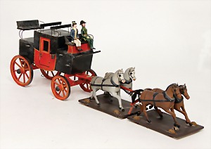 Puppenstuben-Puppe, Amme, 14,5 cm, Biskuit-Brustblatt-Kopf, ohne Unterteil, dazu ein Puppenstuben-Wagen, dekorativ