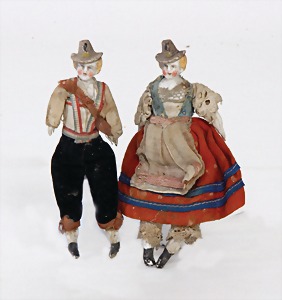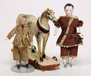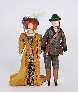 2 Puppenstuben-Puppen, Jäger, 18,5 cm, Biskuit-Brustblatt-Kopf, -Arme u. -Beine, anmod. Schnurrbart, Filzkleidung, Dame, 17 cm, Biskuit-Brustblatt-Kopf, -Arme u. -Beine, rötliche Perücke, Stoffkörper