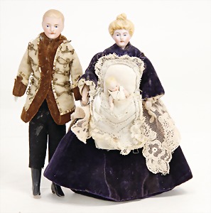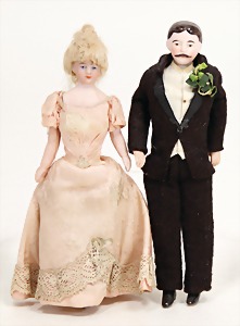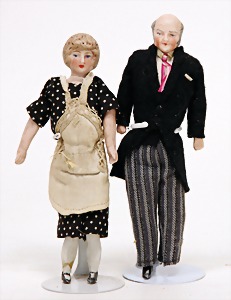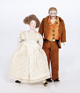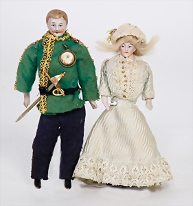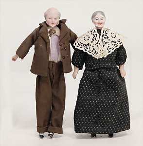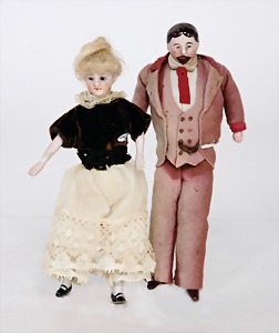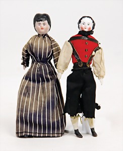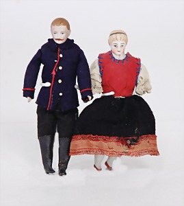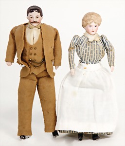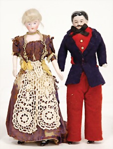 2 Puppenstuben-Puppen, Mann, 16 cm, Biskuit-Brustblatt-Kopf, -Arme u. -Beine, außergewöhnlicher Schnurrbart, Stoffkörper, Orig.-Filzkleidung, Dame, 15,5 cm, Biskuit-Brustblatt-Kopf, -Arme u. -Beine, fest eingesetzte Glasaugen, Kleidung alten Stoffen genäht