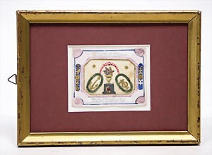 kl. Schatulle, mit losen Blättern, 1839 – 1853, 2 Aquarelle, Haararbeiten, Stickerei, Schatulle mit Prägedruck u. coloriertem Deckbild, ausgefallen
