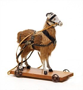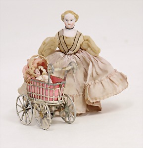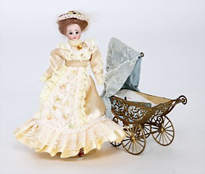 Puppenstuben-Puppe, Dame, 14,5 cm, Biskuit-Brustblatt-Kopf, -Arme u. -Beine, fest eingesetzte Glasaugen, Stoff-Körper, Kleid aus alten Stoffen genäht, dazu schöner kl. Zinn-Puppenwagen