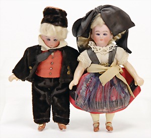 Puppenstuben-Puppen-Paar, Biskuit-Brustblatt-Köpfe, -Arme u. -Beine, Stoffkörper, schöne Orig.-Kleidung, Mann mit anmod. Schnurrbart, 14 cm