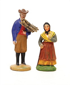 Puppenstuben-Puppen-Paar, 13 cm, Mann, Biskuitbrustblattkopf, anmod. Schnurbart, Biskuit-Arme u. -Beine, Stoffkörper, Filzkleidung, Dame, Biskuitbrustblatt-Kopf, -Arme u. -Beine, Stoffkörper, alte Kleidung