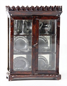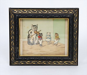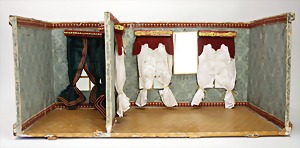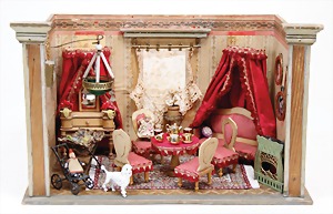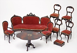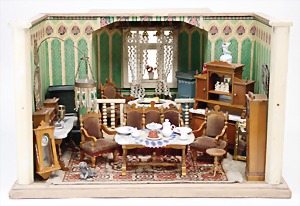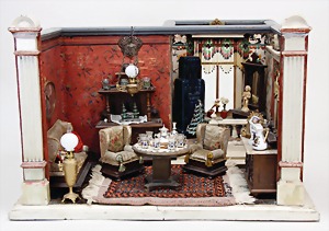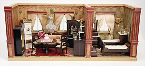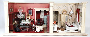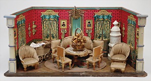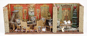 2-tlg. Puppenstube, mit Erker, 97 x 46 x 36 cm, alte Wand- u. Bodentapete, mit Gründerzeit-Holz-Mobiliar, Schlaf- u. Wohnzimmer, Erker mit Thonet-Sitzgruppe, samtbezogen, Schlafzimmer mit 2 Betten, Wäscheschrank, Waschkommode, Wohnzimmer, Sitzgruppe, stoffbezogen, Geschirrschrank, Kommode, 1 Chaiselongue, samtbezogen, Nähtischchen, 3 alte Vorhangschienen mit Klammern, 4 Wandbilder, 1 x 6-armiger Kronleuchter, Messing/Blech vergoldet