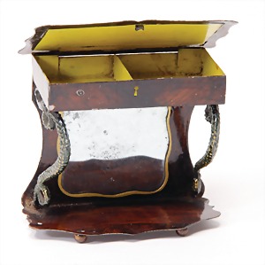 kl. Schatulle "Treue", gefüllt mit wenigen einzelnen Blättern, innen handcolorierte Chromolithographie, zum Aufklappen, Blätter mit Sprüchen u. Schmuck, ca. 1840
