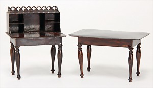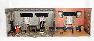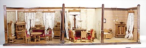 2-tlg. Puppenstube, 61 x 24 x 26 cm, 3 Fenster verglast, mit Durchgangstür, alte Boden- u. Wandtapeten, Wohnzimmer- u. Schlafzimmer-Möbelprogramm, Holz, Wohnzimmer-Garnitur stoffbezogen, Couch, 4 Stühle, 1 Sekretär, Schlafzimmer mit Bett, Schrank u. Kommode, 2 Puppenstuben-Lampen