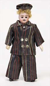Puppenstuben-Puppe, ca. 1910, Biskuit-Brustblatt-Kopf, -Arme u. -Beine, Stoffkörper, Orig.-Kleidung, dazu kl. Kinderwagen, mit Masse-Puppe