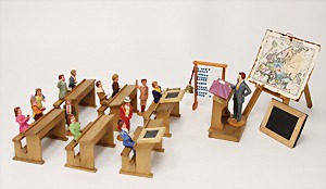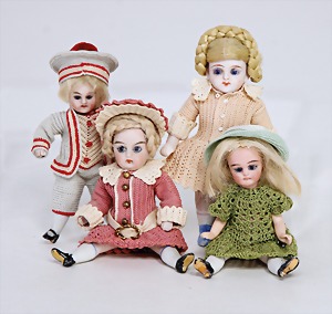 4 Puppenstuben-Puppen, Kinder, Ganzbiskuit, 8,5 - 10,5 cm, Kleidung gehäkelt, evt. für Schule