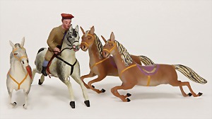 2 Puppenstuben-Puppen, Soldat, 12,5 cm, Biskuit-Brustblatt-Kopf, -Arme u. -Beine, anmod. Schnurrbart, Stoffkörper, Filzkleidung, Dame, Biskuit-Brustblatt-Kopf, -Arme u. -Beine, Stoffkörper, alte Kleidung