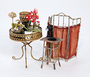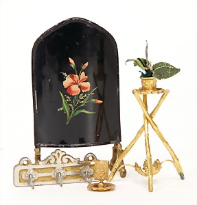 Puppenstuben-Ausschmückungsteile, Blumentisch, 3 Etagen, obere Schale gehalten durch Figur, 12 cm, Blech handlackiert, 1 Paravant, Zinn-Beistelltisch, kl. Telefon
