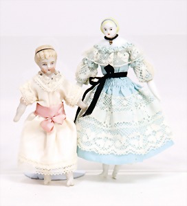2 Puppenstuben-Puppen, Biskuit-Brustblatt-Köpf, -Arme u. -Beine, 11,5 cm, mit anmod. Haarband, Mann mit Schnurrbart, 12,5 cm, alte Kleidung