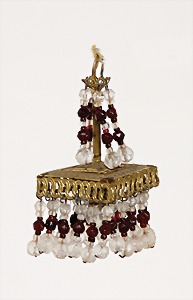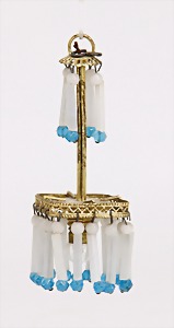 Puppenstuben-Deckenleuchter, teilw. Messingblech vergoldet, Unterteil Zinn, Glasperlen montiert, 15 cm
